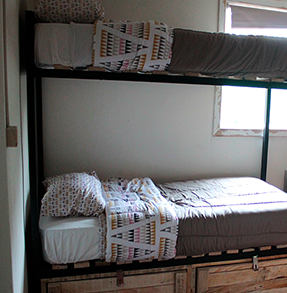 Habitación compartida para cuatro persona equipada con casilleros de madera, calefacción interior y Wi- fi gratis.